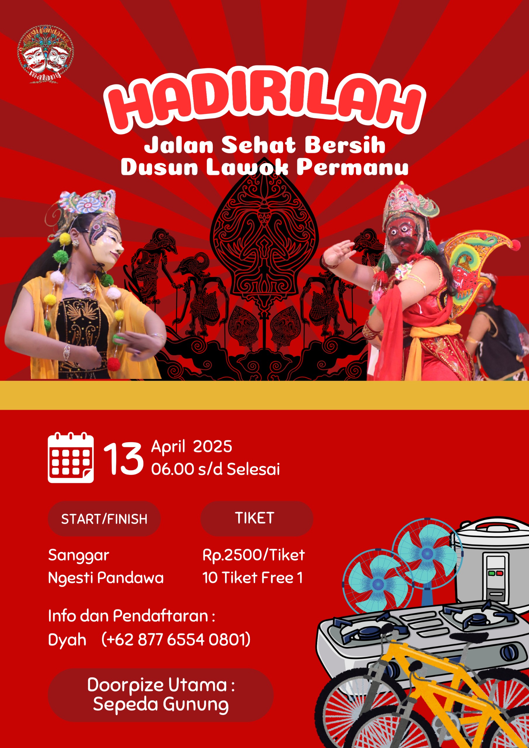 Matic.or.id _ Dalam rangka bersih Dusun Lowok Permanu kecamatan Pakisaji Kabupaten Malang, Padepokan/Sanggar Seni Ngesti Pandawa Pakisaji Kabupaten Malang menggelar jalan sehat dan Gebyak Seni Wayang Topeng dengan lakon "Mbalik e Kereto Kuntoko Wesi" pada hari Minggu, 13 April 2025. Kegiatan ini akan berlangsung di Markas Padepokan Seni Ngesti Pandawa, Dusun Lowok Permanu Kecamatan Pakisaji, Kabupaten Malang.