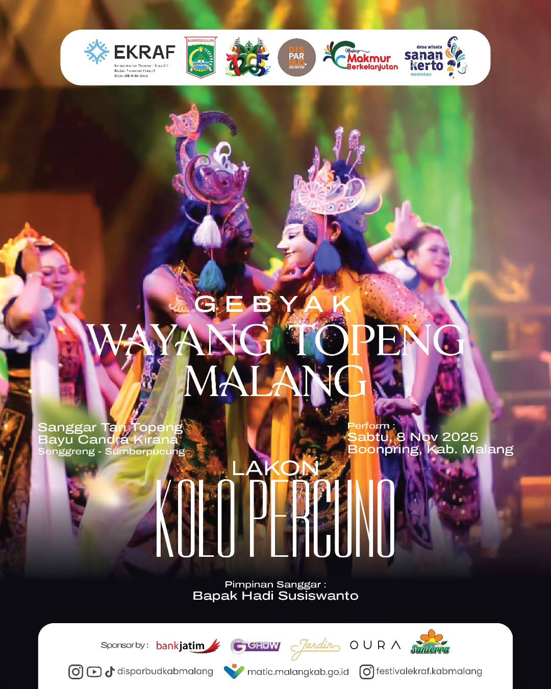 Pertunjukan ini menampilkan keindahan dan kekuatan ekspresi seni Wayang Topeng Malangan dengan lakon KOLO PERCUNO sebagai warisan budaya yang sarat nilai filosofi dan sejarah. Melalui kolaborasi para seniman daerah, kegiatan ini menjadi ajang pelestarian, apresiasi, dan penguatan identitas budaya Malangan, sekaligus memperkaya perayaan Hari Jadi Kabupaten Malang dengan suasana yang meriah, penuh makna, dan bernuansa kearifan lokal. ( crytink/red)