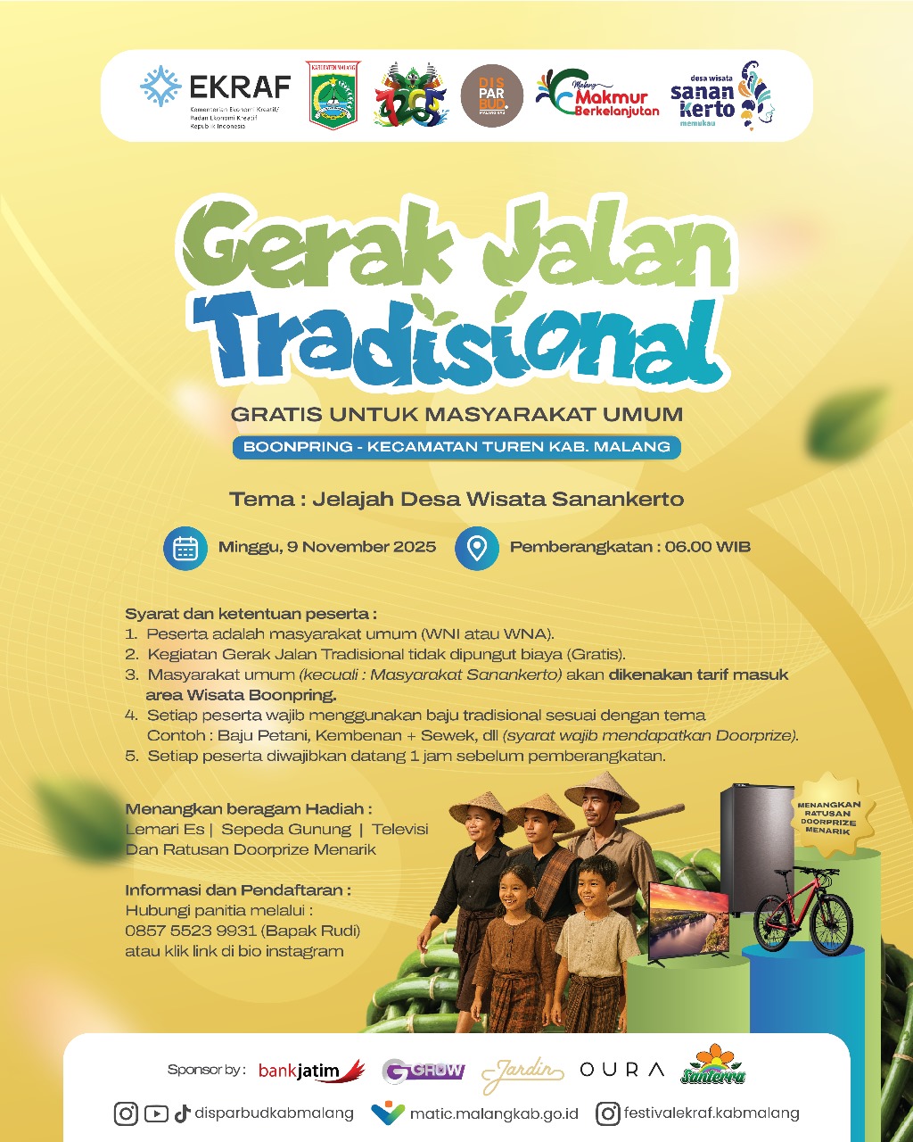 Ikuti Gerak Jalan Tradisional dalam rangka memeriahkan Festival Ekonomi Kreatif dengan tema “Jelajah Desa Wisata Sanankerto”!