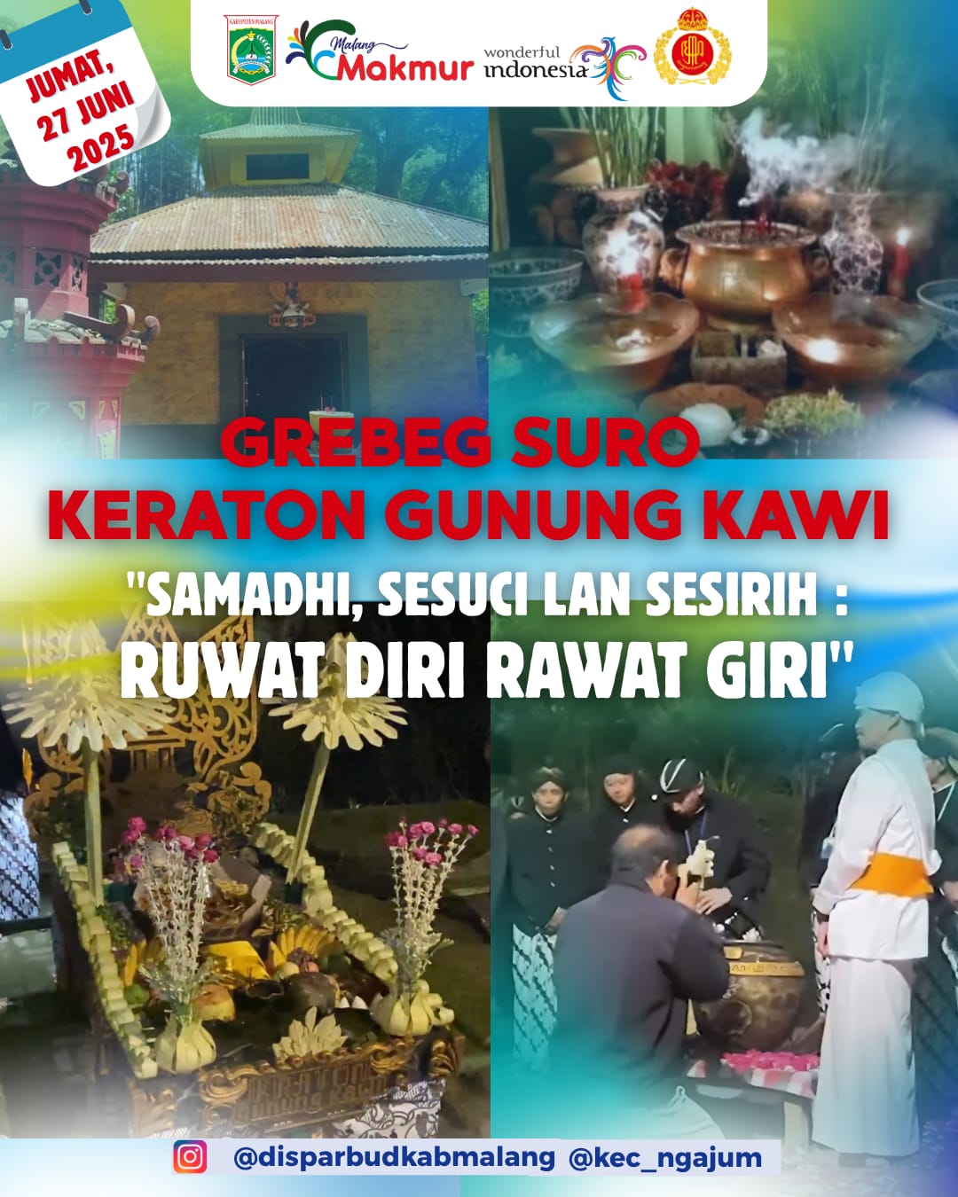 Keraton Gunung Kawi Kecamatan Ngajum akan menggelar kegiatan Grebeg Suro dengan tema "SAMADHI, SESUCi LAN SESIRIH" Ruwat Diri Rawat Giri pada tanggal 27 Juni 2025. Kegiatan ini bertujuan untuk merayakan Tahun Baru Jawa dengan kemegahan dan kesucian.