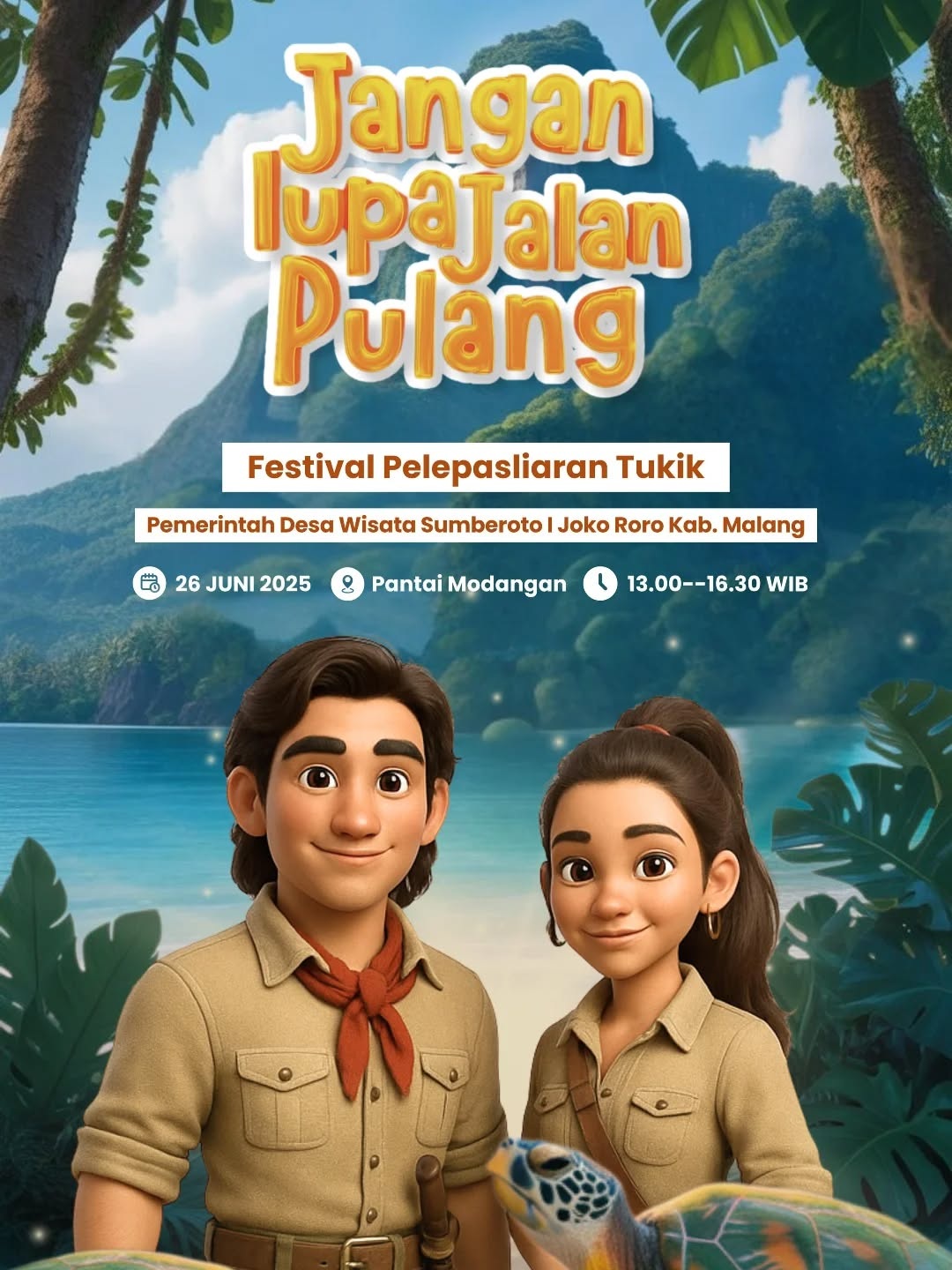 *Pemerintah Desa Wisata Sumberoto* berkolaborasi dengan *Joko Roro Kabupaten Malang* mempersembahkan *Festival Pelepasliaran Tukik*, sebuah aksi nyata peduli lingkungan sekaligus edukasi wisata yang bermakna. Kegiatan ini akan dilaksanakan pada: