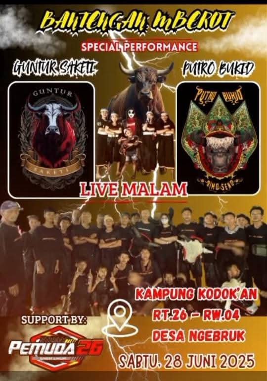 Desa Ngebruk Kec. Sumberpucung, Jangan lewatkan gelaran akbar seni pertunjukan Bantengan yang akan memeriahkan Desa Ngebruk, Sumberpucung, pada hari Sabtu, 28 Juni 2025! Acara istimewa ini akan menampilkan dua grup Bantengan terkemuka, yaitu Bantengan Guntur Sakti dan Putro Bukid, yang siap menghadirkan aksi-aksi memukau dan penuh semangat.