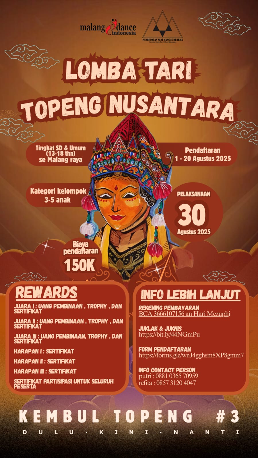 Malang Dance Indonesia bersama Padepokan Seni Mangun Dharma menggelar event lomba tari topeng Nusantara dengan tema "KEMBUL TOPENG #3 2025". Ajang lomba tari ini terbuka untuk tingkat SD & Umum (13-18 tahun) se-Malang Raya dengan tema "Tari Topeng Nusantara".