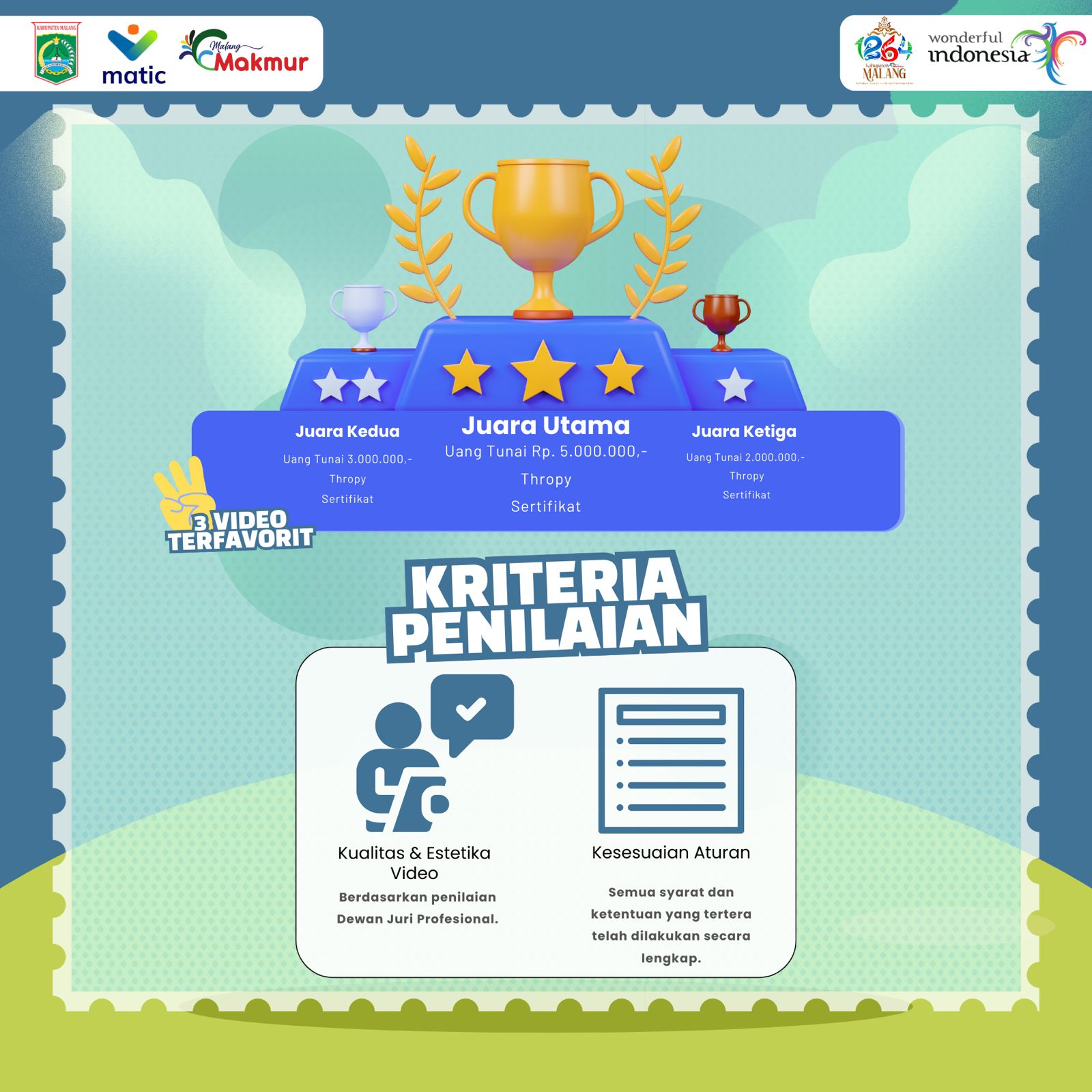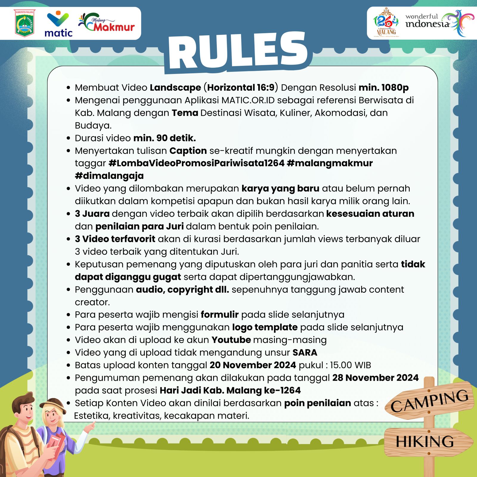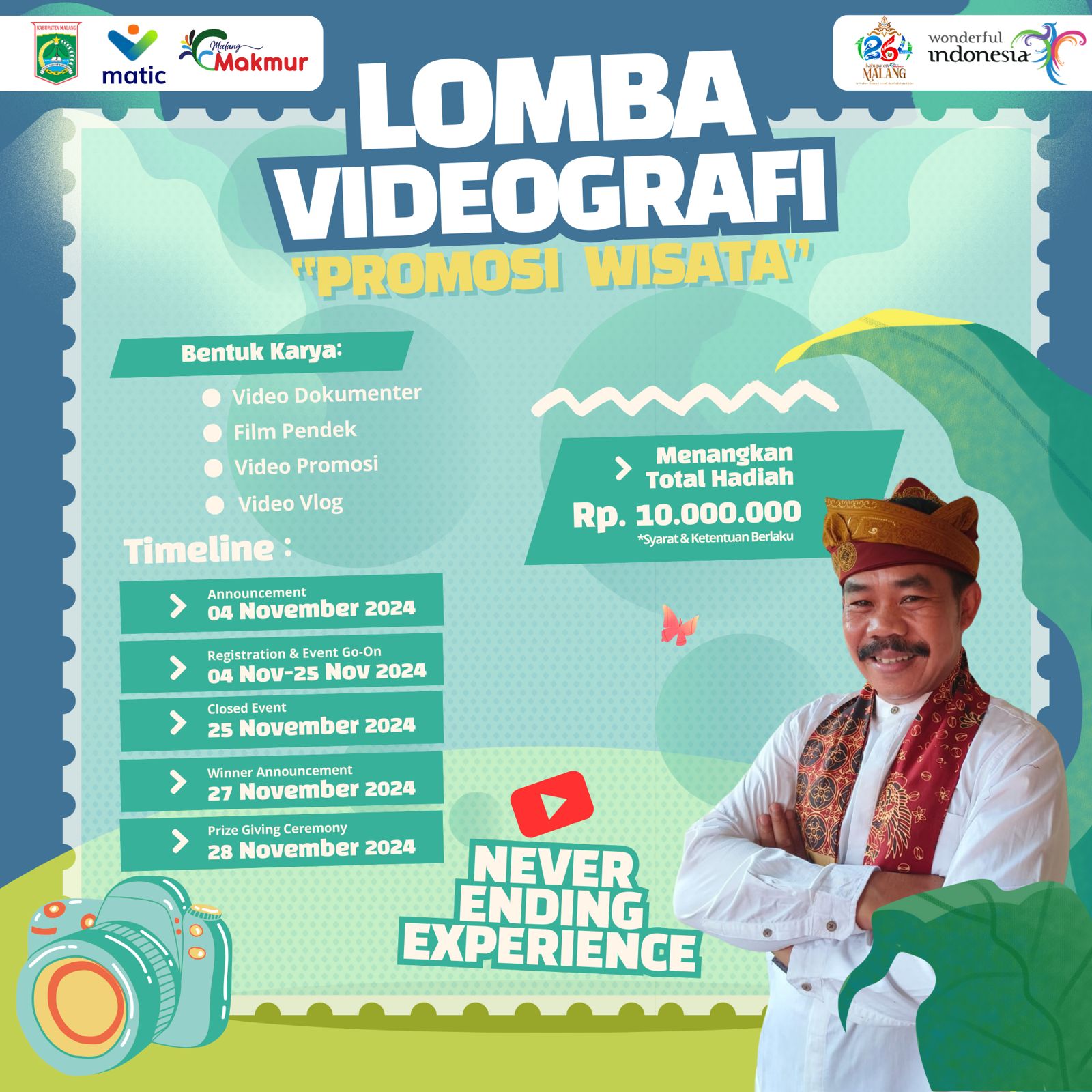 Kabupaten Malang - Dinas Pariwisata menggelar Lomba Video Promosi Pariwisata dengan tema “Never Ending Experience,” mengajak para kreator mengeksplorasi destinasi wisata, kuliner, akomodasi, dan budaya lokal melalui video landscape minimal 1080p. Video berdurasi minimal 90 detik ini harus menonjolkan aplikasi MATIC.OR.ID sebagai panduan wisata di Kabupaten Malang, dilengkapi caption kreatif dan tagar resmi seperti #LombaVideoPromosiPariwisata1264. Setiap peserta diharapkan menggunakan logo yang disediakan serta memastikan karya baru dan orisinal.