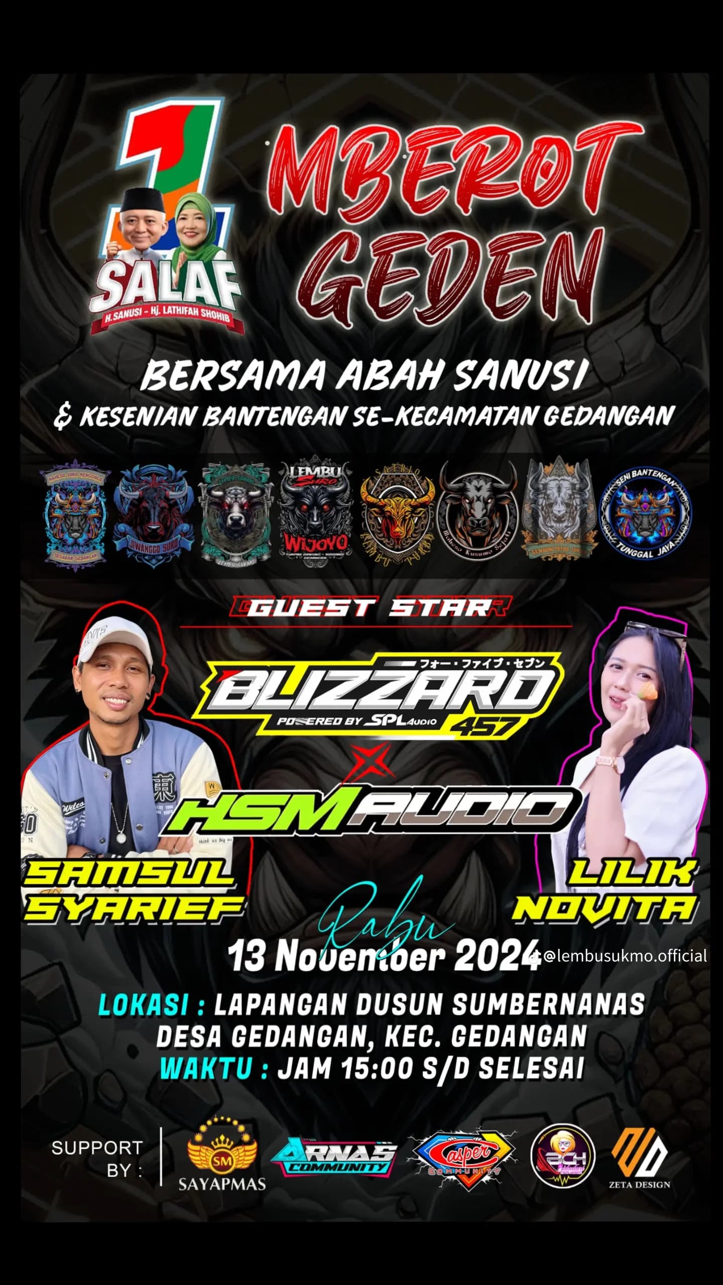 Kabupaten Malang - Pada Rabu, 13 November 2024, Kecamatan Gedangan akan bergetar oleh semangat tradisi dalam Festival Seni Bantengan "Mberot Geden." Berlokasi di Lapangan Dusun Sumbernanas, Desa Gedangan, acara ini diselenggarakan dengan dukungan penuh Abah Sanusi. Mengangkat tema kebudayaan lokal, festival ini tak hanya menampilkan seni Bantengan yang penuh keunikan, namun juga berkomitmen menghidupkan kembali semangat gotong-royong dan cinta budaya di kalangan masyarakat.