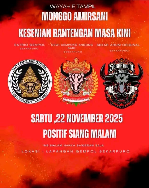 Saksikan kemegahan budaya dalam gelaran Kesenian Bantengan Masa Kini! Tiga grup terbaik dari Sekarpuro—Satrio Gempol, Dewi Cempoko Andong Sari, dan Sekar Arum Original—siap menampilkan aksi spektakuler penuh energi, seni, dan kekompakan.