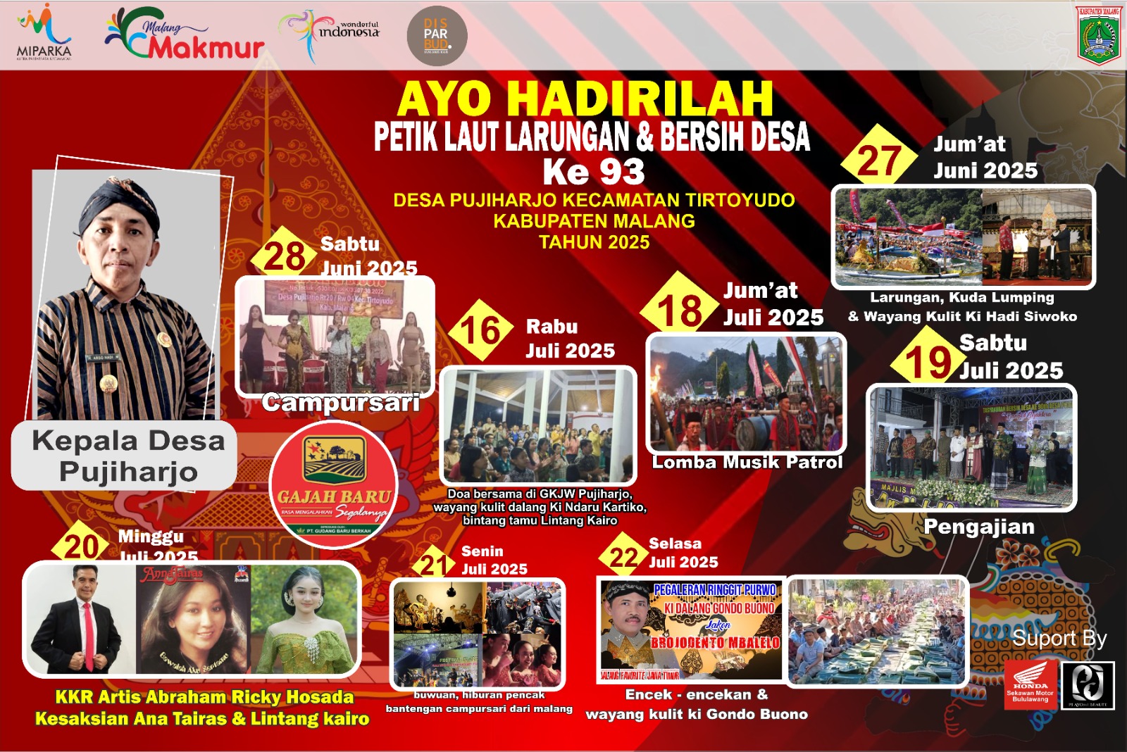 Pagelara wayang kulit Bersih Desa Pujiharjo adalah kegiatan adat tradisi yang diselenggarakan di Desa Pujiharjo Kecamatan Tirtoyudo Kab. Malang. Kegiatan ini bertujuan untuk memperingati dan melestarikan tradisi dan budaya masyarakat setempat. sebagai bentuk penghormatan dan permohonan keselamatan kepada Tuhan YME, serta membersihkan desa dan lingkungan sebagai bentuk kesadaran dan tanggung jawab masyarakat.