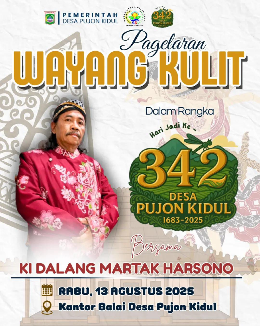 Desa Pujon Kidul akan menggelar Pagelaran Wayang Kulit dalam rangka memperingati Hari Jadi Desa Pujon Kidul yang ke-342. Kegiatan ini akan menampilkan pertunjukan wayang kulit yang dibawakan oleh Ki Dalang Martak Harsono, seorang dalang wayang kulit yang terkenal dan berpengalaman.