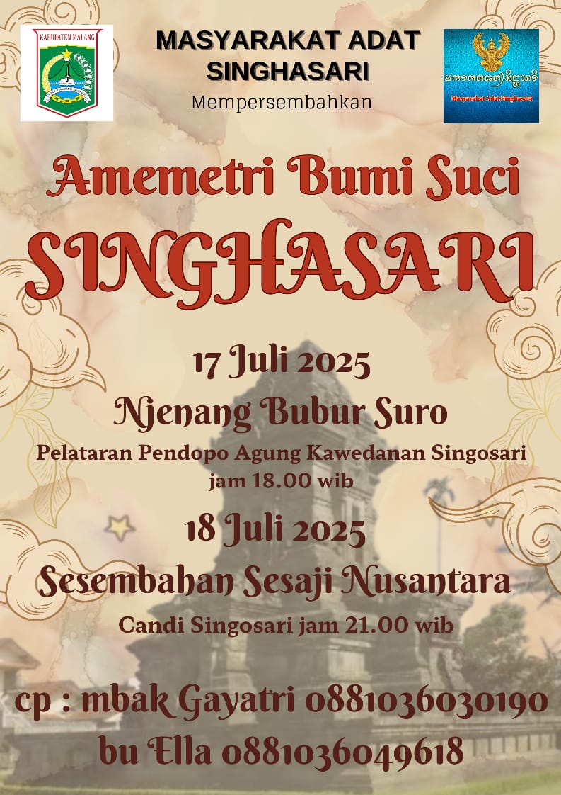 Masyarakat Adat Singosari akan menggelar kegiatan Amemetri Bumi Singhasari pada tanggal 17&18 Juli 2025. Kegiatan ini terdiri dari dua acara utama, yaitu Njenang Bubur Suro dan Sesembahan Sesaji Nusantara.