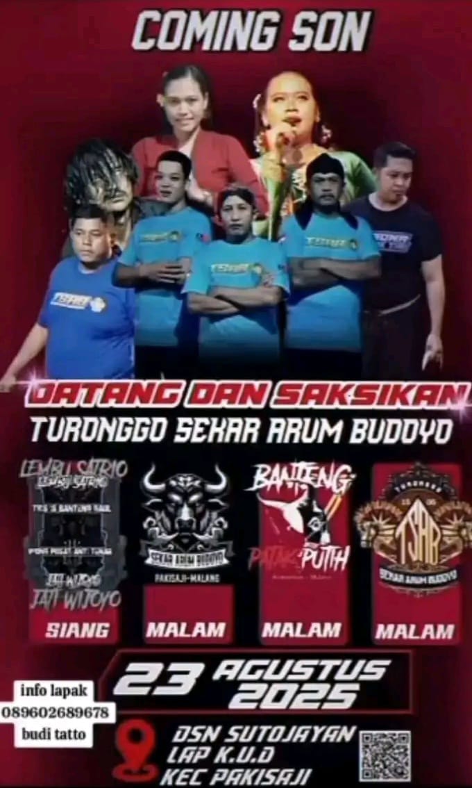 Desa Sutojayan, Kecamatan Pakisaji. akan menggelar pertunjukan kesenian bantengan pada tanggal 23 Agustus 2025 di, Lapangan KUD Desa Sutojayan. Pertunjukan ini akan dimeriahkan dengan kolaborasi antara Turonggo Sekar Arum Budoyo dengan beberapa kelompok kesenian bantengan dari wilayah Pakisaji.