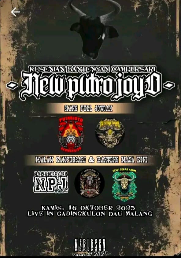 Hari Kamis, 16 Oktober 2025, Desa Gading Kulon, Kecamatan Dau, akan menjadi tuan rumah pertunjukan kesenian yang spektakuler! New Putro Joyo akan membawakan pertunjukan Bantengan dan Campursari yang memukau. dengan rangkaian Acara: