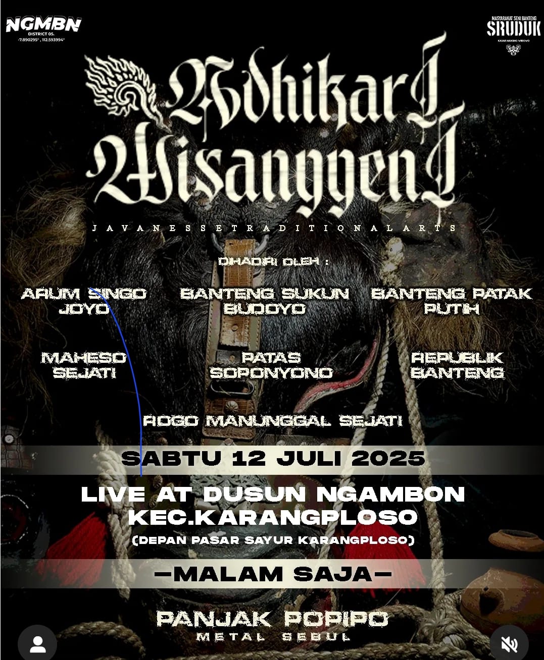 Pertunjukan seni Bantengan Malangan Adhika Wisanggeni akan diselenggarakan di Dusun Ngambon Kecamatan Karangploso, pada hari Sabtu tanggal 12 Juli 2025 di lapangan Desa Ngambon ( depan Pasar sayur) karang ploso start pukul 20:00 sampai dengan selesai.