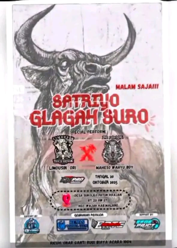 Kegiatan “Satrio Glagah Suro” merupakan sebuah pertunjukan seni dan budaya yang menampilkan adu performa bantengan dalam nuansa tradisi khas Kqbupqten Malang. Acara ini akan digelar pada malam hari, menonjolkan semangat dan kekuatan simbolik banteng sebagai representasi keberanian dan kegagahan.