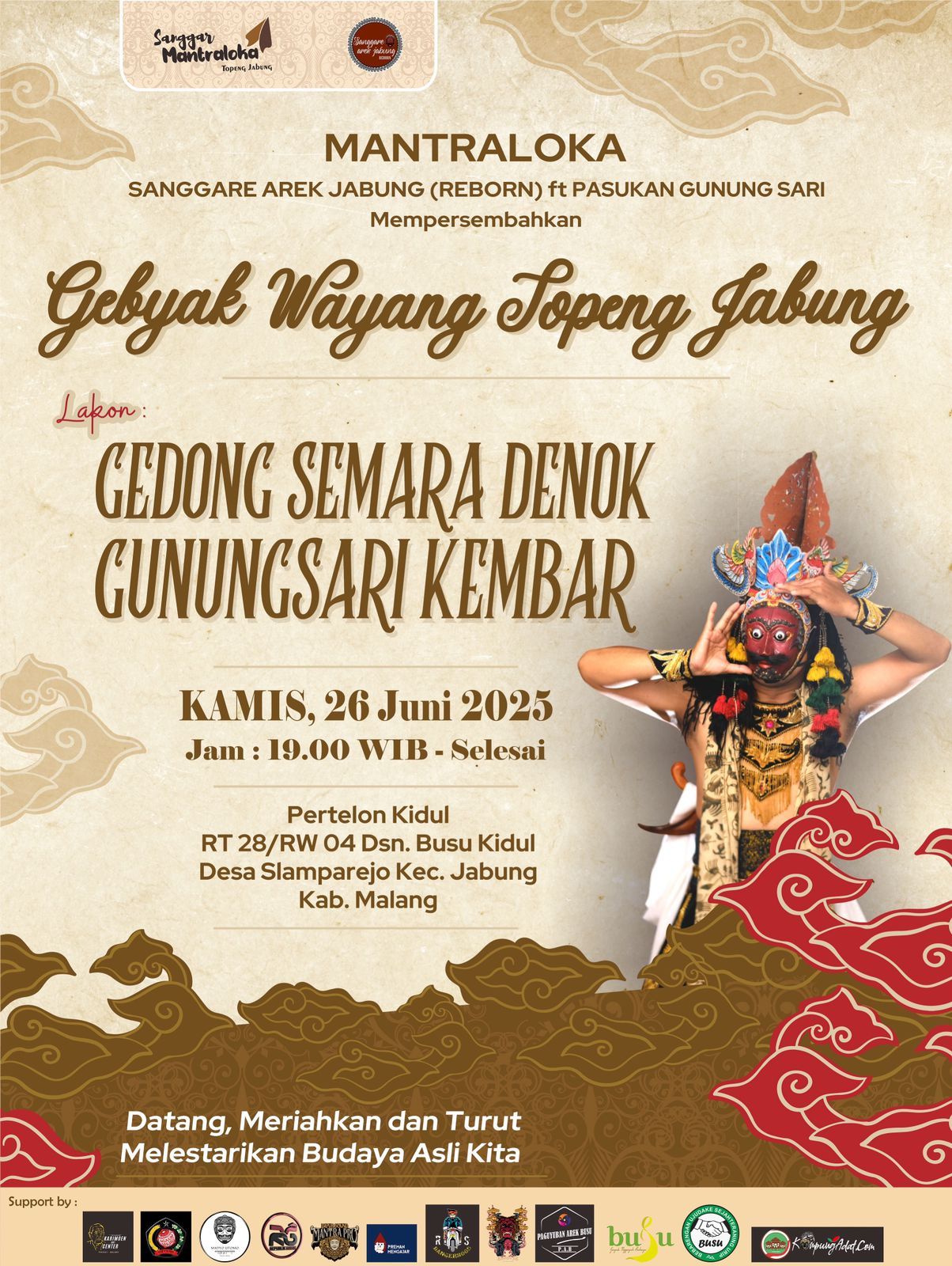Sanggar Wayang Topeng Malangan Mantraloka Jabung Kab. Malang akan menggelar pertunjukan wayang topeng dengan lakon "Gedong Semara Denok Gunungsari Kembar" pada: