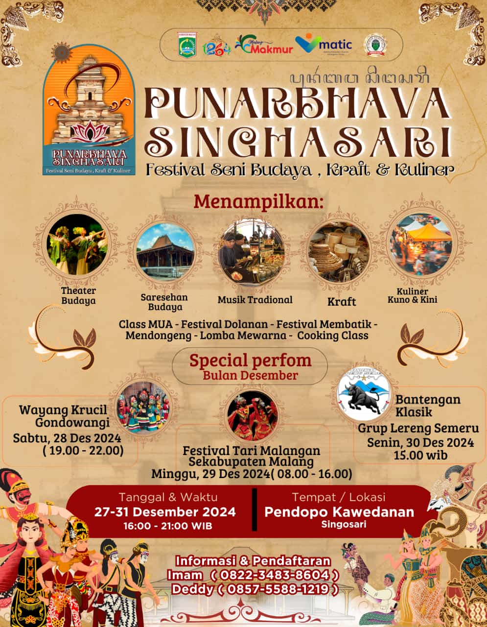 Matic.or.id_ Dinas pariwisata dan kebudayaan kab.Malang bekerjasama dengan Budayawan dan Pelaku seni Kab Malang mengelar Festival Seni Budaya dan Kuliner bertajuk "Punarbhava Singhasari" pada tanggal 27 hingga 31 Desember 2024 di Pendopo Kawedanan Singosari. Festival ini menghadirkan berbagai atraksi seni yang menceritakan kejayaan Singhasari yang kembali hidup dalam tema Punarbhava. Pengunjung dapat menikmati pertunjukan tari tradisional, musik khas daerah, pameran seni, serta mempelajari berbagai warisan budaya Singhasari. Tidak hanya seni, festival ini juga menawarkan ragam kuliner khas Singhasari yang lezat dan unik. Dengan suasana yang kaya akan nuansa sejarah dan budaya, festival ini merupakan tempat yang sempurna untuk merayakan keberagaman seni dan kuliner yang khas daerah.