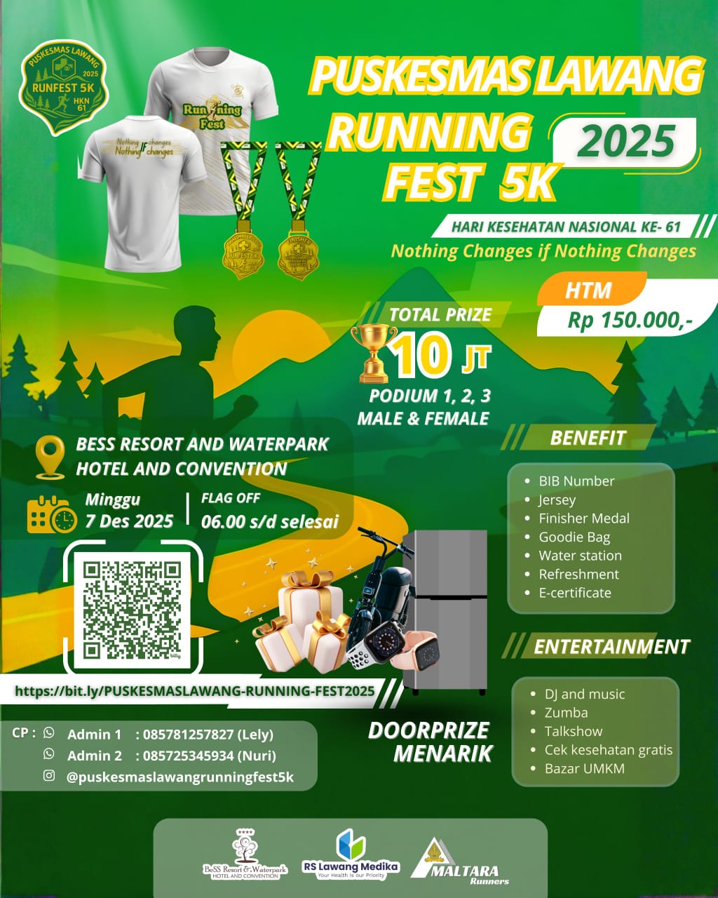 Mulai langkah sehatmu dan jadilah bagian dari semangat perubahan di Puskesmas Lawang Running Fest 2025.
