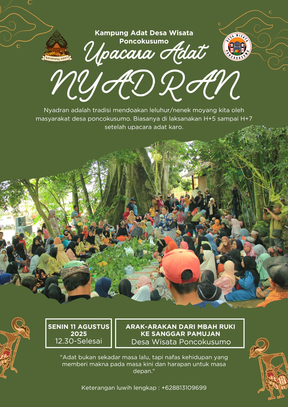 Rangkaian acara Nyadran akan dimulai dari kediaman Mbah Ruki (sesepuh desa) menuju Sanggar Pamujan Desa Wisata Poncokusumo. Acara ini akan dilaksanakan pada hari Senin, 11 Agustus 2025, pukul 12:30 s/d selesai.