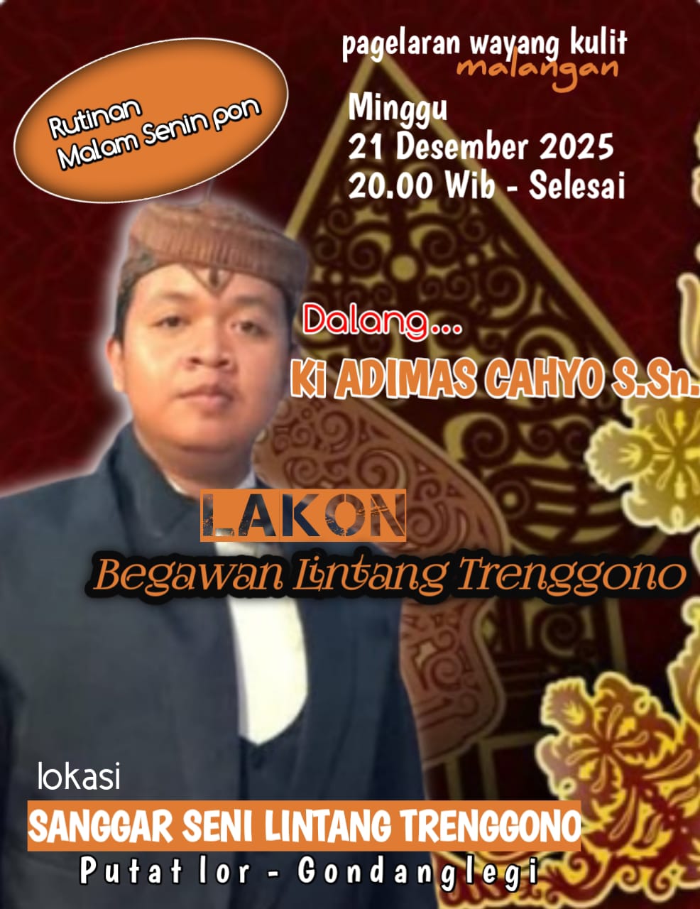 Pagelaran akan dilaksanakan pada Minggu, 21 Desember 2025, mulai pukul 20.00 WIB hingga selesai, bertempat di Sanggar Seni Lintang Trenggono, Putat Lor, Kecamatan Gondanglegi. Pada kesempatan ini, akan dipentaskan lakon “Begawan Lintang Trenggono” dengan Dalang Ki Adimas Cahyo, S.Sn, yang dikenal konsisten mengembangkan pakeliran Wayang Kulit gaya Malangan.