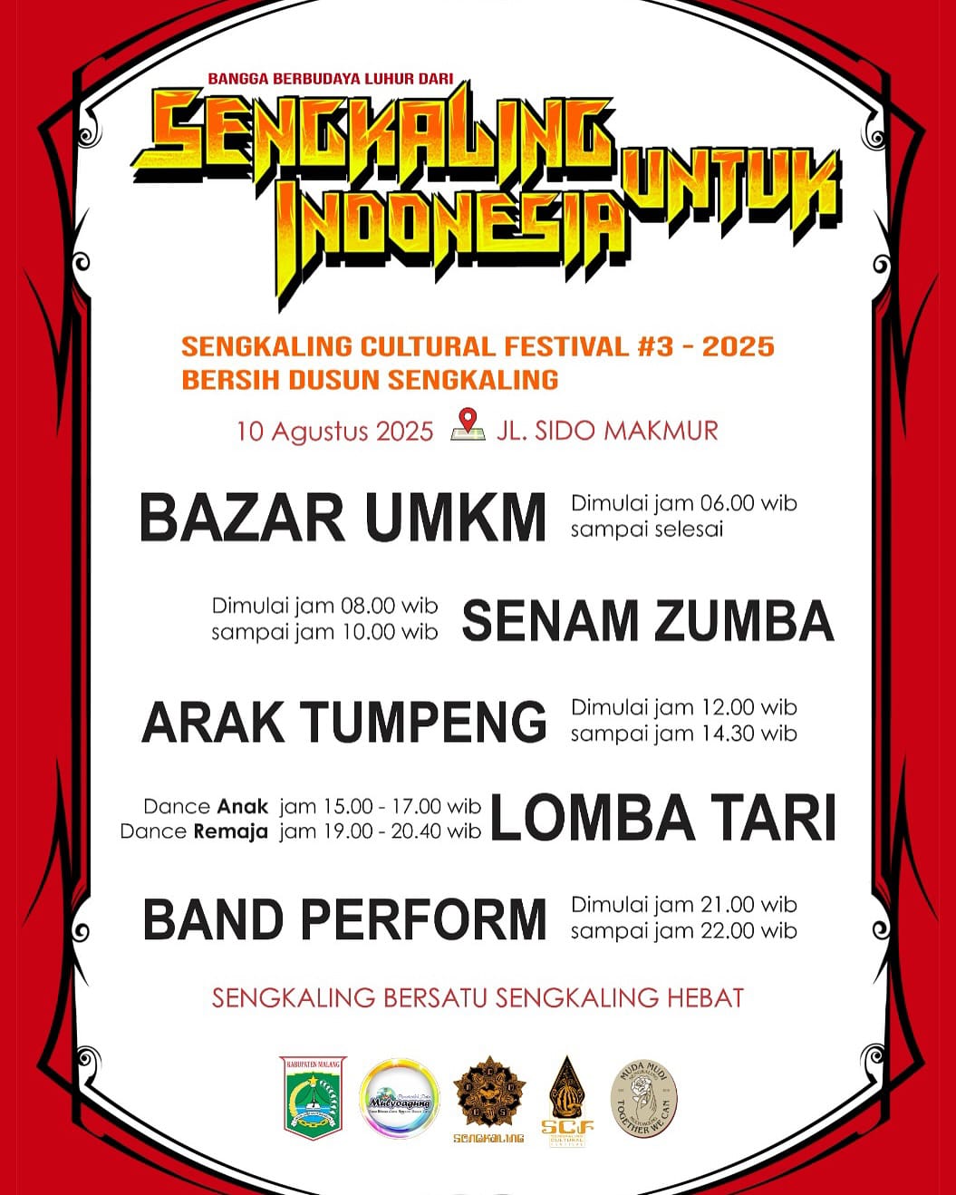 Sengkaling Cultural Festival adalah kegiatan yang diselenggarakan dalam rangka Bersih Dusun Sengkaling dengan tema "Bangga Berbudaya Luhur dari Sengkaling untuk Indonesia". Kegiatan ini akan diadakan pada tanggal 10 Agustus 2025, mulai pukul 06:00 s/d 22:00 di Jalan Sidomakmur Sengkaling Raya.