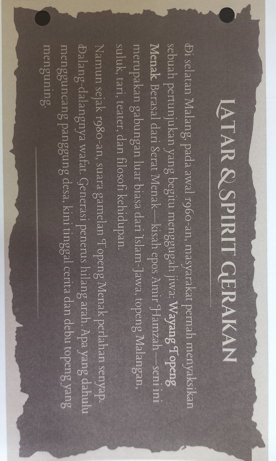Dalam rangka memperingati Hari Masyarakat Adat Sedunia, PBNU LESBUMI dan PCNU Kota Malang akan menyelenggarakan kegiatan Burak Bawono Minak, yaitu upacara adat kebangkitan Wayang Topeng Minak. Kegiatan ini akan berlangsung pada hari Sabtu, tanggal 9 Agustus 2025, bertempat di Pendopo Taman Suko, Desa Sukowilangun, Kecamatan Kalipare, Kabupaten Malang.