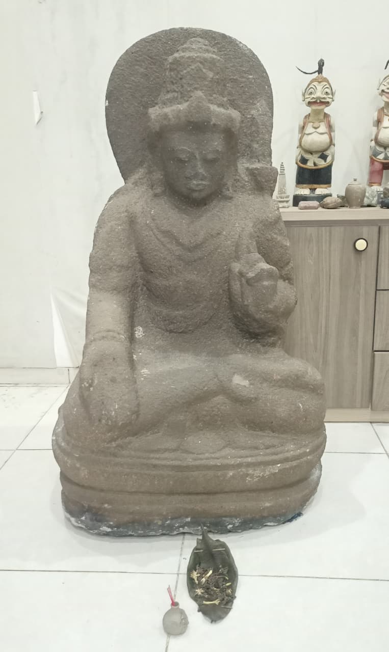Terbuat dari batu andesit, dengan panjang 65 cm, lebar 55 cm, dan tinggi 127 cm, arca menggambarkan sosok Buddha dalam sikap duduk (dhyana asana) dengan ketenangan ekspresi wajah yang khas. Lingkaran cahaya (prabhamandala) di belakang kepala menegaskan kedudukannya sebagai figur suci. Detail pahatan pada rambut, utas jubah, dan posisi mudra tangan menunjukkan gaya seni pahatan masa Singhasari–Majapahit yang menonjolkan kesederhanaan bentuk namun sarat makna filosofis.