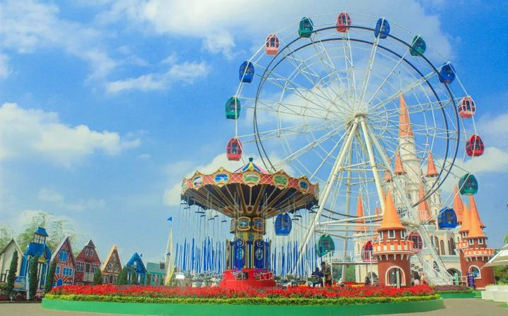 Selain taman bunga, Santerra menawarkan wahana seperti Ferris Wheel, House of Terror, Rainbow Slide, dan Dino World, serta fasilitas pendukung seperti food court, toilet, mushola, dan area parkir luas