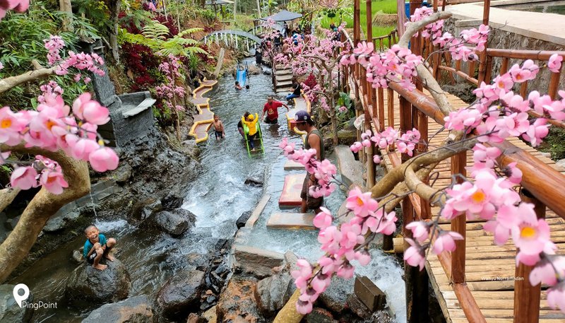 Nuansa Jepang semakin terasa dengan hiasan-hiasan yang menghiasi sepanjang aliran sungai. Deretan lampion berwarna-warni, umbul-umbul, dan bunga sakura buatan yang menggantung di atas sungai menambah daya tarik tempat ini. Bunga sakura yang terkenal sebagai simbol keindahan di Jepang, meskipun buatan, tetap memberikan sentuhan estetis yang memikat hati. Selain menikmati pemandangan, pengunjung juga dapat merasakan sensasi seru bermain river tubing dengan menggunakan ban yang mengapung di atas aliran sungai yang tenang.
