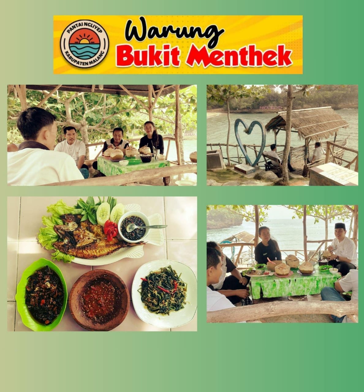 Warung Bukit Menthek terletak di Wisata Pantai Ngliyep, Desa Kedungsalam, Kecamatan Donomulyo, Kabupaten Malang. Menyuguhkan hidangan Ikan segar dan rica-rica gurita dengan bonus pemandangan laut Pantai Selatan yang sangat eksotis. Salah satu menu andalan di Warung Bukit Menthek adalah Kakap Bakar Ratu Kidul, dengan ikan kakap merah segar yang dipanggang disajikan dengan sambal kecap dan sambal mentah. Di Warung Bukit Menthek juga menyediakan minuman segar alami kelapa muda yang tentunya bisa merefresh tubuh disaat cuaca yang sangat panas. Mau Makan Enak dan Bergizi, Bonus Pemandangan Pantai Eksotis..Yuks Ke Warung Bukit Menthek ..!!!