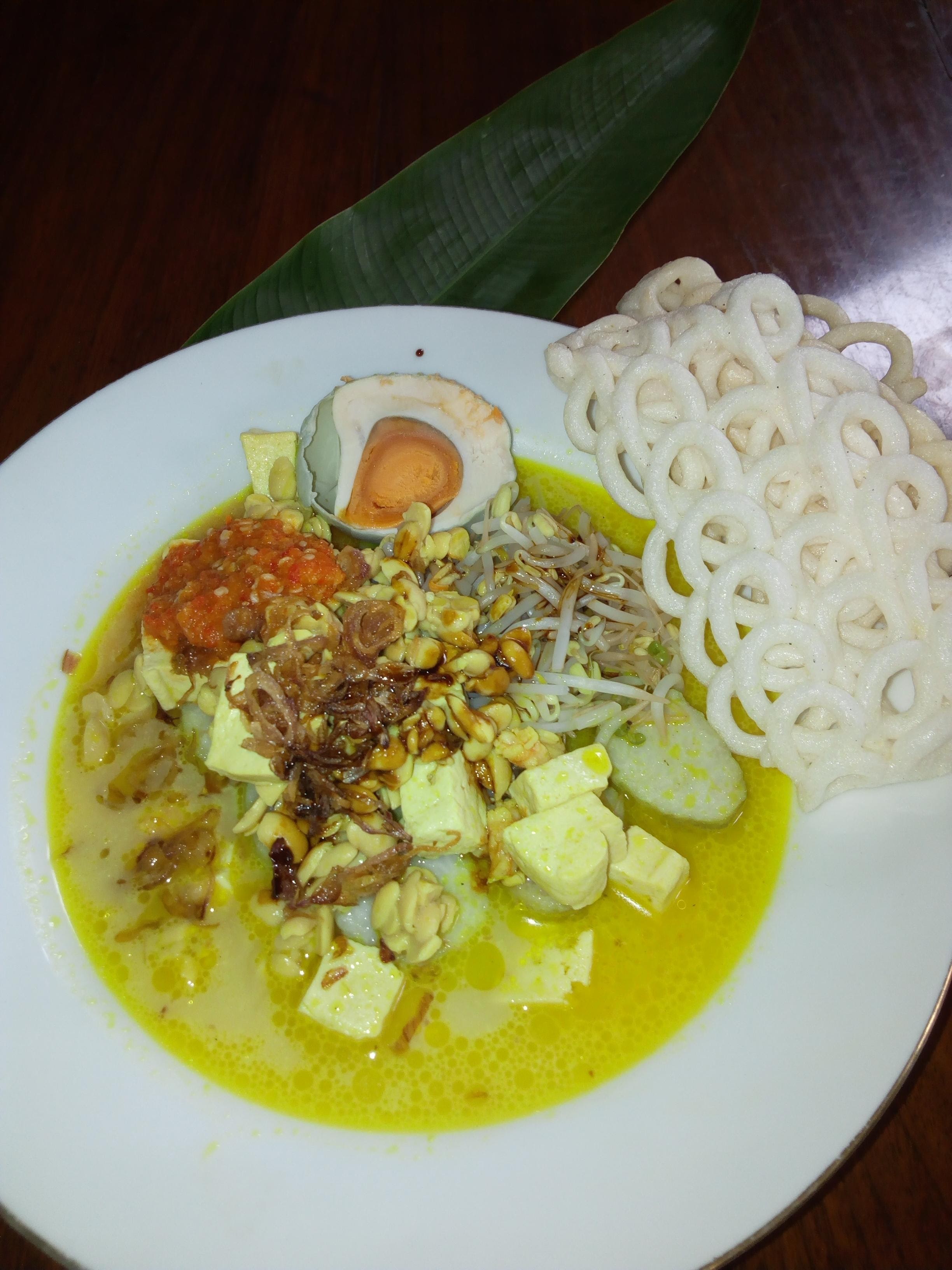 Ditambahkan sedikit tauge rebus, suwiran daging ayam (tergantung warung), dan wajib ditaburi kerupuk yang diremukkan di atasnya sebelum disantap.
