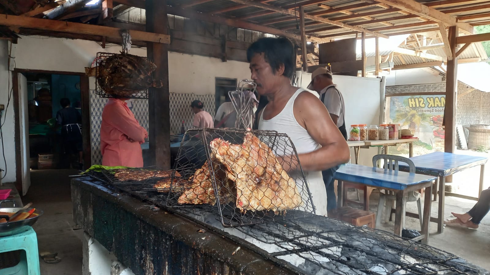 Di bagian belakang warung, pengunjung juga bisa melihat langsung proses pembuatan aneka olahan seafood. Ada karyawan yang membakar ikan dan sate, ada pula yang menggoreng dan membuat sambal.