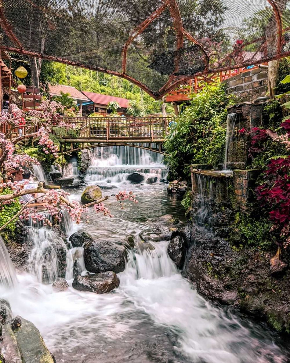 Nuansa Jepang semakin terasa dengan hiasan-hiasan yang menghiasi sepanjang aliran sungai. Deretan lampion berwarna-warni, umbul-umbul, dan bunga sakura buatan yang menggantung di atas sungai menambah daya tarik tempat ini. Bunga sakura yang terkenal sebagai simbol keindahan di Jepang, meskipun buatan, tetap memberikan sentuhan estetis yang memikat hati. Selain menikmati pemandangan, pengunjung juga dapat merasakan sensasi seru bermain river tubing dengan menggunakan ban yang mengapung di atas aliran sungai yang tenang.